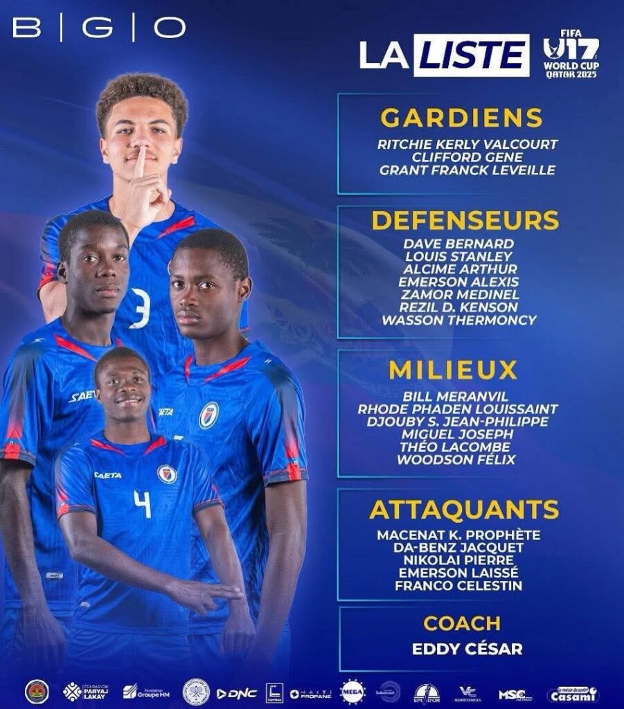 Dans le but de réaliser une bonne performance lors de la Coupe du monde des moins de 17 ans, qui se déroulera du 3 au 27 novembre 2025 au Qatar, Me Edy César a tranché malgré l’absence d’un joueur important, et a rendu publique, ce vendredi 24 octobre 2025, la liste des joueurs qui représenteront Haïti lors de la compétition.