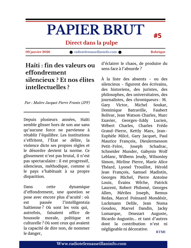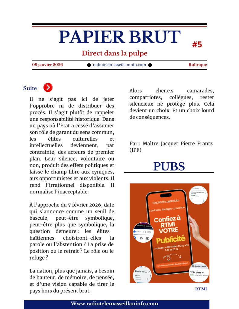 À l’approche du 7 février 2026, date qui s’annonce comme un seuil de bascule, peut-être symbolique, peut-être plus que symbolique, la question demeure : les élites haïtiennes choisiront-elles la parole ou l’abstention ? La prise de position ou le retrait ? Le rôle ou le refuge ?